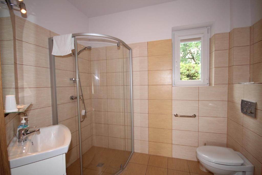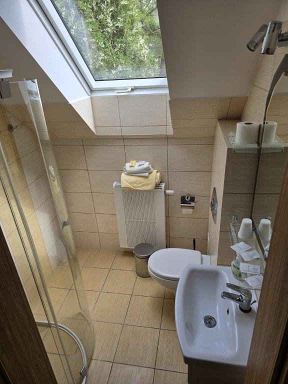 Każdy pokój posiada prywatną łazienkę z prysznicem, suszarką do włosów oraz bezpłatnym zestawem kosmetyków.